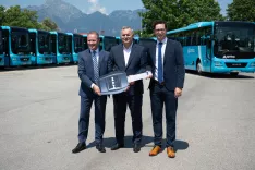 Simbolični prevzem novih avtobusov (z leve): Direktor podjetja MAN Truck & Bus Slovenija Jan Löwhagen, minister za okolje, podnebje in energijo Bojan Kumer in direktor skupine Arriva Slovenija Aleš Šifrer / Foto: Primož Pičulin