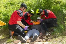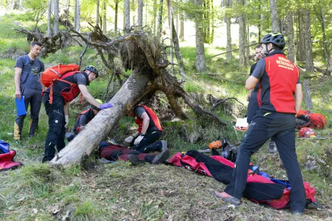 Gorski reševalci so v enem od scenarijev iz gozda reševali ponesrečenca s poškodbami glave. / Foto: Peter Košenina