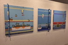 Tokrat na ostenju galerije predstavlja tri umetniške cikle, s 24 slikami okroglega formata je tu serija Soncu v čast, ki jo razvija že peto leto, na nasprotni strani je trideset risb, ki jih je poimenoval Iz risarskega dnevnika – mediteranski arhetipi tu pa so še tri večja platna iz cikla Spuščanje zmajev v Mediteranu. V nadaljevanju je pogovor stekel na temo podob, ki jih avtor vključuje v sliko, od pinij, cipres, poraslih gričev do sonc in očes v živopisnih krajinah ... Na mizi sta bili dve sliki v začetku nastajanja, ko slikar najprej v tehniki kolaža na ploskev nalepi obraze, izrezane iz revij, in jih v njihovi minljivosti kasneje preplasti s prej omenjenimi podobami. Na slikah ustvarja mediteransko toplino in pozitivno vzdušje.