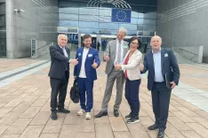 Predstavniki slovenskih organizacij na Koroškem (od leve) Valentin Inzko, Roman Roblek, Rudi Vouk, Augustine Gasser in Gabrijel Hribar pred stavbo Evropskega parlamenta v Bruslju. / Foto: Novice Celovec