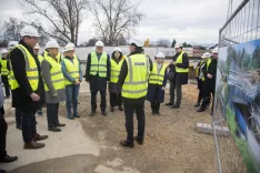 Predsednik vlade Robert Golob si je v družbi ministra Jožeta Novaka in domžalske županje Renate Kosec ogledal potek gradnje mostu na Viru. / Foto: Aleš Senožetnik