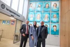 Župan Radovljice Ciril Globočnik, nekdanja vrhunska plavalka Sara Isaković in Matjaž Han, minister za gospodarstvo, turizem in šport, pred portreti članov Plavalnega kluba Radovljica, ki so bili udeleženci olimpijskih iger / Foto: Tina Dokl