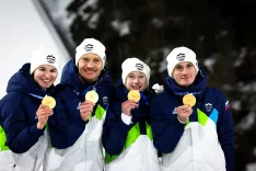 Predazzo – Slovenski kvartet Nika Vodan, Anže Lanišek, Nika in Domen Prevc je na srednji skakalnici v Predazzu osvojil olimpijski naslov na tekmi mešanih ekip. Slovenci, ki so uspešno ubranili naslov iz Pekinga 2022, so zmagali z veliko prednostjo kar 30,9 točke pred Norvežani na drugem mestu. Tretji so bili Japonci (+35,2 točke).
