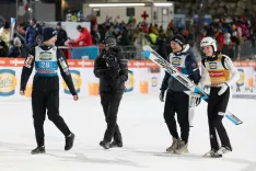 Slednji si je nekaj trenutkov vzel tudi za navijače iz Dolenje vasi in jih prišel pozdravit. Oblečeni so bili v majice z zlatim orlom. »Danes nas je prišlo dvajset. Tudi če se Domen ne bi boril za zlatega orla, bi bili tukaj. To je eno izmed prizorišč, na katerem kar redno podpiramo naše sovaščane iz skakalne družine Prevc. Bili smo že ob slavju Petra. Biti zraven ob takšnih uspehih je prestiž, prav neverjetno je in zelo smo veseli. Vzdušje je odlično. Navijamo z navijači Roka Oblaka, torej smo se združili navijači iz Selške in Poljanske doline. V manj številni zasedbi smo bili skupaj že v Oberstdorfu. Večer bo še dolg, a jutri je delovni dan, tako da bo treba kar hitro nazaj proti Sloveniji,« je bil dobre volje Janez Rakovec, vodja navijačev bratov in sestre Prevc iz Dolenje vasi. Med navijači iz obeh dolin smo opazili tudi dva župana: Železnikov Marka Gasserja in Gorenje vasi - Poljan Milana Čadeža, poleg njiju pa še poslanca Žana Mahniča.