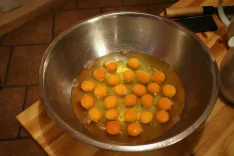 V skledo ubijemo jajca, jih solimo in popramo ter razžvrkljamo. Tavčar je jasen, da če jih razžvrkljamo na roke, bomo dobili najboljši rezultat. Za dva kilograma kruha on uporabi trideset jajc. »Res je nadev bogat, vendar je tudi dober.«