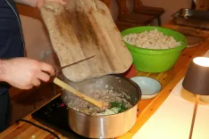 Čebulo drobno sesekljamo in jo na segretem olju v ponvi prepražimo. »Sam vedno mešam belo in rdečo čebulo, zaradi okusa.« Pražimo jo toliko časa, da je zlato rjava. »Sredi praženja solimo. Ko čebula začne rjaveti, dodamo in popražimo majaron, timijan, šetraj, malo popra – po občutku, da začimbe zadišijo.« Dodamo tudi česen, peteršilj, zalijemo z vodo, v kateri se je kuhalo meso, zmešamo in vse skupaj polijemo po kruhu. Dodamo še meso, je pa dobro, da se zmes ohladi, preden ji dodamo jajca. Nato seveda vse dobro pregnetemo.