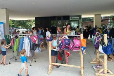 Na stojalih so bila tokrat le otroška oblačila in šolske torbe, na policah pa zvezki, knjige in peresnice. / Foto: Marjana Ahačič