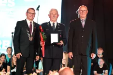 Zlato priznanje sta župan Bogo Ropotar in predsednik občinske komisije za podeljevanje priznanj Stanislav Golob predala Miru Urbancu (na sredini), in sicer za dolgoletno delo in zasluge v PGD Loka pri Mengšu. / Foto: Tina Dokl