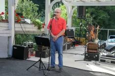 »V svojem imenu in imenu preminulih fantov se želim zahvaliti vsem, ki so idejno in finančno prispevali k postavitvi spominskega znamenja,« je poudaril Andrej Bergant. Spominsko ploščo so postavili na rojstno hišo leta 2019 preminulega člana Janeza Dolenca, ki je bil obenem svak Andreja Berganta, saj je ta poročen z Dolenčevo sestro. »Tu smo se mladi Fantje s Praprotna radi zbirali in prepevali od vsega začetka. Razveseljevali smo priložnostne poslušalce v tedanji gostilni Kazina in že tedaj občutili sladkosti aplavza, ki nas je spremljal vse do današnjih dni,« je povedal Bergant. Ko so Fantje s Praprotna začeli sodelovati s Slakom, je nastal ansambel, ki je po besedah Berganta že v prvih desetih letih dosegel vrh kakovosti in popularnosti doma in po svetu. Fantje s Praprotna iz takratnega obdobja si še kako zaslužijo upodobitev na spominskem znamenju, je dejal Bergant ter se zahvalil tudi kasnejšim članom, ki so prav tako pripomogli k uspešnemu delu pevske zasedbe.