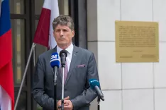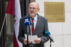 Spominsko ploščo so odkrili kranjski župan Matjaž Rakovec, sodelujoči pri premestitvi orožja Peter Mavser in Jelko Kacin, ki je odredbo podpisal. / Foto: Primož Pičulin