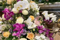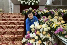 Letos sta dekoracijo, za katero sta tradicionalno uporabila bele slovenske orhideje, dopolnila še z vijoličastimi orhidejami – tako rezanimi kot celimi rastlinami, skupaj kar tristo lončkov. Ob tem sta uporabila še kar tisoč alstroemerij, osemsto vrtnic bele, rožnate in marelične barve, 160 rumenih krizantem, 160 rumenih nageljnov in 100 modrih hortenzij.