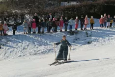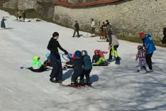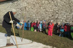 Škofja Loka – Minulo sredo dopoldne je bilo na mini smučišču, ki je že ves mesec pod Škofjeloškim gradom, še posebno živahno. Kar nekaj skupin vrtčevskih otrok je prišlo na ogled starodobnih smučarjev, članov Društva Rovtarji, prav tako pa so mladi na tečaju spoznavali smučarsko opremo in nekateri naredili svoje prve zavoje.