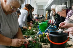 Priznana slovenska florista Sabina Šegula in Peter Ribič sta na dobrodelni delavnici izdelovanja adventnih venčkov predstavila projekt letošnje božične krasitve bazilike v Vatikanu, kamor se odpravljata 21. decembra. / Foto: Matic Zorman
