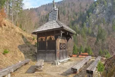 Pri kapelici zavijemo levo, nato pa zelo hitro dosežemo kolovoz. Kolovoz zavije levo in mu sledimo do odcepa levo. Po nekaj nadaljnjih korakih dosežemo Mali Juhej, 820 m n. m.