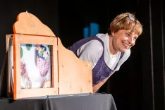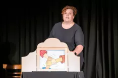 Jelena Sitar s kamišibajem Optična prevara / Foto: Nik Bertoncelj