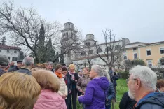 Najprej smo se po ozki poti zapeljali do Mirenskega gradu, ki stoji na griču nad Mirnom. Ob poti so nas spremljale kapelice križevega pota, ki so jih zgradili leta 1931 po načrtih arhitekta Ivana Vurnika, rojenega v Radovljici. Mirenski grad je duhovno središče v bližini Nove Gorice, v preteklosti znano in množično obiskano romarsko središče, kjer danes delujejo lazaristi z duhovnikom dr. Petrom Žakljem na čelu, sestre usmiljenke in Društvo prostovoljcev Vincencijeve zveze dobrote. Ob vhodu nas je pozdravila tudi sestra Ancila, ki se je pridružila vodnici. Povedala nam je na primer, da je na bližnjem pokopališču pokopanih 183 sester usmiljenk, kar govori o tem, kako velik je bil nekoč ta samostan. Danes so v njem še štiri sestre. Sestra Ancila nas je nato popeljala po svetih stopnicah, na vrhu katerih je božji grob s fresko, ki jo je naslikal Tone Kralj. Ta pogumni rodoljub in krščanski humanist se je v času italijanske fašistične okupacije Primorske izpostavil zlasti skozi umetnost tudi kot protifašist in na veliko svojih slikah in cerkvenih freskah upodabljal fašiste kot zveri, Mussolinija pa kot hudiča oz. kot Kristusove krvnike. S podobno tematiko je opremil tudi slike v mirenski cerkvi Žalostne Matere Božje. Oko obiskovalca cerkve pritegne Kraljev kip Žalostne Matere Božje, ki v naročju drži Dete – kombinacija klasične in moderne kiparske tehnike. Za plačilo za svoje poslikave je Tone Kralj prosil zgolj za hrano in nekaj malega za materialne stroške. Skupaj smo v cerkvi zapeli še dve pesmi in se zatem sprehodili po okolici cerkve. Spoznali smo, kakšno je delo varovancev in uslužbencev na Mirenskem gradu ter katera dela opravljajo sami. Skupnost, ki tam biva, je v veliki meri samooskrbna – ukvarjajo se z vrtnarjenjem, gojijo nekaj prašičev. Zelenjavo, ki jo na vrtu pridelajo sami, tudi večinoma sami porabijo, viške pa konzervirajo ali prodajo.