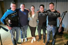 Ansambel bratov Poljanšek v družbi harmonikarja in pevca Gašperja Seljaka (tretji z leve), ki prihaja iz Preddvora / Foto: Alenka Brun