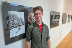 Bine Mekina ob razstavljeni nagrajeni fotografiji turnega smučarja z naslovom Šc izza ravnine / Foto: Marjana Ahačič