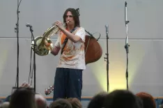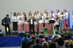 Na koncertu se je šolskemu pevskemu zboru, glasbeni skupini in zboru učiteljev pridružil tudi težko pričakovani gost Vlado Kreslin. / Foto: Alenka Brun