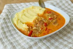 Piščančja bedra začinimo s soljo in poprom ter jih popečemo na olju. Dodamo sesekljano čebulo, da postekleni, in nato narezano papriko in česen ter pražimo še nekaj minut. Vse skupaj posujemo z mleto papriko, dodamo lovorjev list in prilijemo vodo ali jušno osnovo. Pokrijemo in kuhamo od 30 do 40 minut, da se meso zmehča. Na koncu vmešamo kislo smetano in pokuhamo še nekaj minut, da se omaka poveže. Postrežemo s prilogo, kot so pire krompir, polenta ali rezanci.