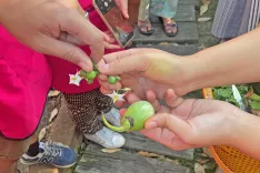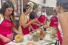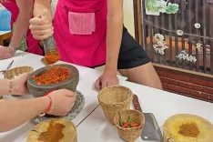 Tam sva, tako kot drugi člani naključno zbrane skupine bodočih »kuharskih mojstrov«, poleg začetnih napotkov in predstavitve tečaja prejela še smešno velik slamnik in živo rožnat predpasnik. Tako opremljeni smo se najprej odpravili na bližnjo tržnico, kjer nam je Nana predstavila razne vrste čilijev, ribjih omak in zelišč, ki jih uporabljajo pri kuhi, nato pa smo kaj kmalu tudi sami zavihali rokave in se lotili priprave petih različnih jedi. »Tajci kuhamo z ljubeznijo,« nam je najprej povedala Nana in ob tem v vroč vok zlila dve veliki žlici olja, prepražila česen, piščanca in tofu ter v naslednjih nekaj minutah na krožnik že servirala slasten pad thai. Tej praženi jedi sta sledili papajina solata in aromatična juha tom saap, v katero smo dodali različna tajska zelišča: limonino travo, galang, kombavo in čili. V nadaljevanju nas je Nana naučila pripraviti še tri vrste past – za rdeči, zeleni ter kremni masaman kari, ki smo jih morali jezno pretolči v glinenem možnarju.