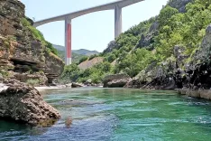 Letos bom nadaljeval tam, kjer sem takrat končal. Sledi nezahteven del z neverjetno lepimi tolmuni in visokimi konglomeratnimi stenami kanjona, ki se počasi razširja in niža. Na nekem mestu ga prečka avtocestni viadukt Moračica, ki so ga Kitajci zgradili pred petimi leti. Pogled nanj človeku vzame dih. Eleganten in gigantski. Trije stebri so visoki 158 m, med njimi pa je 190 m razpona! Črnogorci so na najvišji steber s ponosom namestili ogromno črnogorsko zastavo.