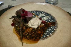 Večerja sedmih kuharskih mojstrov vsako leto predstavlja edinstven kulinaričen večer, poln dobre volje, odličnih sestavin in vrhunskih jedi. In ob znanem Šobčevem bajerju je v izjemnem ambientu njegove restavracije najprej kot predjed na mizo prispela šarenka, dimljena v jabolčnem lubju, s kefirjevo omako, oljem mlade špinače, vloženo redkvico, kumaro, hrenovo granito in postrvjimi ikrami. Pod jed sta se podpisala Uroš Štefelin in Milan Milanović. Za toplo predjed sta združila moči Aleš Tavčar in Gašper Kordež, na krožniku pa si je roko podal domači raviol s krvavico s škampom in omako z dodanim okrasjem – črno trobento. Združila sta morski in gorenjski okus, kot sta se izrazila. Za glavno jed je seveda poskrbel kuhar restavracije gostiteljice Marko Švalj v sodelovanju z Jakobom Jeralo. File divje svinje, kostanjeva espuma, korenje v pepelu, fermentirane brusnice, zemeljski crumble oziroma drobljenec, Tilia vinska redukcija in mikro koriander so bili na krožniku zaradi barvnih kombinacij videti skoraj kot napoved za prihajajoči 31. oktober, a okusi so »štimali«. Krajnc pa je poskrbel za zadnji hod: sladico. Jabolčni drobljenec, limetin sladoled z dodano svežo jogurtovo omako s cimetom in drugimi začimbami je kljub morda medli napovedi jedi na jedilnem listu presenetil, če ne kar zelo zelo navdušil.
