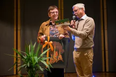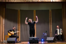 Marija Volčjak ob zaključku svoje dolgoletne kariere z zasedbo Etno banda Poseben gušt, ki je poskrbela za odlično glasbeno spremljavo njenega poslovilnega večera / Foto: Primož Pičulin