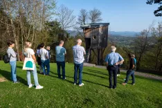 Obiskali smo tudi Hišo Drevo na Šenturški Gori, ki dokazuje, da človek za udobno bivanje ne potrebuje veliko prostora. Po namembnosti je opazovalnica, a ima vse atribute funkcionalne enote na višini krošenj dreves z notranjo infrastrukturo za dve osebi. Stoji na edinstveni lokaciji s čudovitim pogledom na osrednji del Slovenije na robu domačije Grilčevih. Objekt je zgrajen po načrtih arhitekta Boštjana Debelaka, ki pa so, kot je dejal lastnik Gregor Grilc, več kot deset let čakali na izvedbo. Kljub majhnosti, objekt namreč v celoti meri le 11 kvadratnih metrov, je gradnja trajala dve leti in je bila zaključena leta 2021.