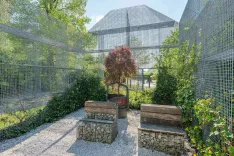 Sodobna konstrukcija iz kovinskih mrež, odeta v zelenje, ki ponazarja tloris nekdanje Korenove hiše / Foto: Nik Bertoncelj
