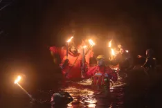 Potapljači ob soju ognja in odsevov na Črnavi nežno potopijo božično drevo v jezero. / Foto: Matic Zorman