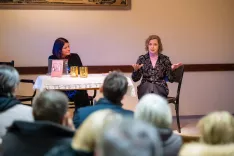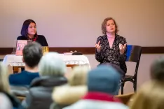 Avtorica romana Nataša Konc Lorenzutti (desno) ter moderatorka pogovora in urednica Zarika Snoj Verbovšek na predstavitvi romana v Kropi / Foto: Nik Bertoncelj