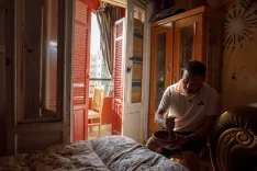 Shorook (arabsko: sončni vzhod), nadarjena grafična oblikovalka, je bila evakuirana iz Gaze v družbi matere, bolnice z rakom. Fotografirana je na balkonu stanovanja, gledajoč v sončni zahod. / Foto: Matic Zorman