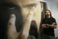 Mohor Kejžar pred muralom Poglej me v oči!, ki ga je na galerijsko steno naslikal za čas razstave. / Foto: Igor Kavčič
