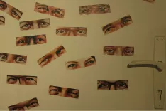 Kot običajno pogled od vhodnih vrat Galerije Ivana Groharja v Škofji Loki najprej usmerim naravnost k osrednji steni prostora. »V oči me glej!« preberem podobo, s katere morda nekoliko ukazovalno zahteva avtoportret avtorja tega velikega murala Mohorja Kejžarja. Slikar, glasbenik in vsestranski ustvarjalec, ki je postal širše prepoznaven po poslikanih skalah nad domačo vasjo Sorica, predstavlja izbor del v različnih medijih in tehnikah. Na temo oči seveda.