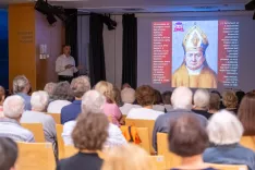 Predstavitev knjige, v ozadju računalniško ustvarjen portret Janeza Krstnika Prešerna, izdelan na podlagi podobe na freski iz stolnice sv. Nikolaja v Ljubljani / Foto: Nik Bertoncelj