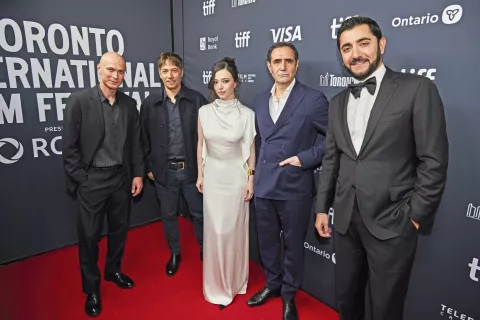 Ekipa filma Anora na festivalu v Torontu, 8. septembra 2024. Z leve: Yura Borisov, Sean Baker, Mikey Madison, Karren Karagulian in Vache Tovmasyan. / Foto: Wikipedija