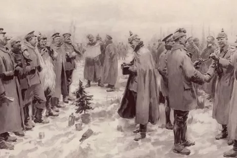 Ta ilustracija prikazuje legendarno božično premirje leta 1914, ko so vojaki na zahodni fronti spontano prekinili sovražnosti in si voščili za božič. / Foto: Wikipedija