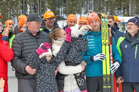 Najboljšemu slovenskemu biatloncu Jakovu Faku družina pomeni največ in ob njem je bila tudi v nedeljo, ko se je poslovil od tekmovanj svetovnega pokala na Pokljuki. Kot je napovedal, bo vztrajal še prihodnjo sezono, v kateri pa Pokljuke ni v koledarju. / Foto: Tina Dokl