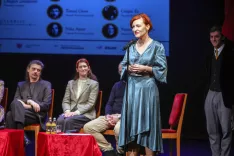 Sledil je pogovor z nagrajenci. Kot običajno je vprašanje voditeljice pogovora in s tem besedo prva dobila tokratna prejemnica Prešernove nagrade za življenjsko delo Dragica Čadež. Kdaj jo je nagovorilo kiparstvo, da se je odločila zanj? »Likovnost je bila v naši družini nekako vseskozi prisotna, saj je bil oče ljubiteljski slikar, za današnje pojme na zelo solidnem nivoju. Za kiparstvo pa sem se odločila na mariborski Prvi gimnaziji. Hodila sem na kiparski krožek, kjer sem bila kuhana in pečena – vse odmore in popoldneve sem bila v delavnici, vsi sošolci so bili modeli. Tu sem pridobila tudi potrebno znanje za sprejemni preizkus na akademiji,« je povedala Dragica Čadež; da mora kipar sicer poznati vse materiale, tako kamen in beton kot les, keramiko ... V nadaljevanju pa je občinstvu razložila nekatere razlike v delu z njimi. Na vprašanje, kaj se ji v življenju zdi najbolj obstojno, na kaj se najbolj zanese, pa je dejala, da noben material ni obstojen, vsak propade. »Edino, kar je obstojno, je neka energija, razmišljanje, ki te vodi pri delu.«