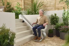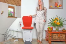 Naša stopniščna dvigala so oblikovana ergonomsko. Sedeži in hrbtna naslonjala na stopniščnih dvigalih so izdelani iz mehke prevleke, udobje pa zagotavlja tudi zanesljiv in stabilen pogonski sistem, ki omogoča tekočo in tiho vožnjo. Vrtljiv sedež na koncu tirnice omogoča udobno in varno sedanje in vstajanje. Poleg tega varnostni senzorji zagotavljajo, da se stopniščno dvigalo takoj zaustavi, če zadene ob oviro.