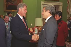 Epstein pri predsedniku Clintonu v Beli hiši (1993), desno od njega njegova zvodnica Ghislaine Maxwell. Med njegovimi klienti je bil tudi predsednik Trump. / Foto: Wikipedija