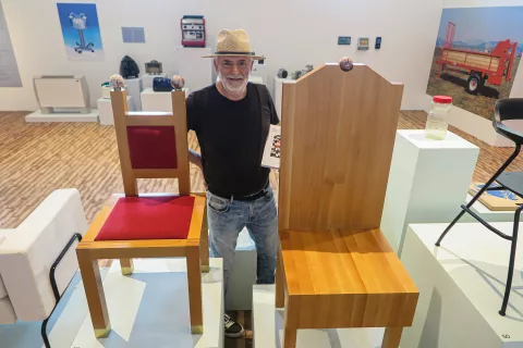 Marjan Žitnik ob lanski pregledni razstavi svojih oblikovalskih dosežkov na Škofjeloškem gradu / Foto: Igor Kavčič