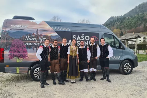 Novo vozilo Ansambla Saša Avsenika, kombi, ki bo prevozil milijone kilometrov po vsej Evropi, je opremljeno s prepoznavno podobo Julijskih Alp. / Foto: Marjana Ahačič