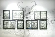 »V prvem galerijskem prostoru so Jazbečeve prigode iz zadnjega albuma V temačnih vodah, ki ga danes tudi premierno predstavljamo. Jazbec se v njem zaplete v reševanje sebe in svojih dveh najboljših prijateljev Orla in Medveda iz velikih poplav, ki jih je – sicer nenamenoma – povzročil sam,« pove kuratorka razstave Katerina Mirović. K originalnim stripovskim tablam, ki jih na osrednji steni plemeniti tudi izrisan glavni junak, je dodanih tudi nekaj pripomočkov, ki jih pogumna trojica uporablja. Pripravil jih je še en Stripburgerjevih avtorjev Andrej Štular.