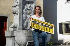 Tina Rus z velikim abakusom, ki je osnova učenja metode Brainobrain. / Foto: Jošt Gantar
