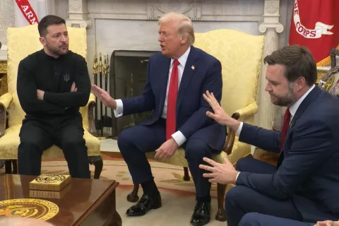 Ukrajinski predsednik Zelenski med hudo diskusijo s predsednikom Trumpom in podpredsednikom Vanceom v Ovalnem uradu Bele hiše 28. februarja 2025 / Foto: Wikipedija