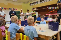 Šolarje v Bohinju je na prvi šolski dan pozdravil minister za notranje zadeve Boštjan Poklukar, ki ga je spremljal namestnik generalnega direktorja Policije Igor Ciperle.