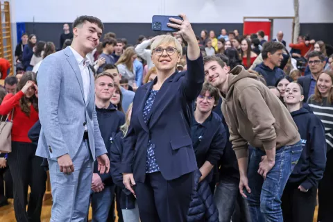 Po prevzemu častnega pokroviteljstva projekta zMigaj se je predsednica države Nataša Pirc Musar z veseljem fotografirala tudi z dijaki Gimnazije Kranj. / Foto: Tina Dokl