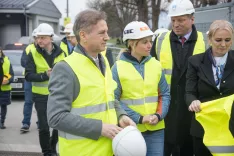 Predsednik vlade Robert Golob si je v družbi ministra Jožeta Novaka in domžalske županje Renate Kosec ogledal potek gradnje mostu na Viru. / Foto: Aleš Senožetnik